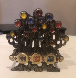 Vintage Jewish Judaica napkin holder made of bronze and brass, featuring colorful enamel circles and decorative Hebrew text$35Ocean Ridge, FL