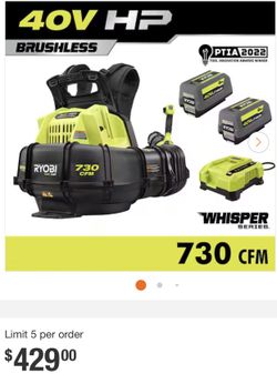 RYOBI 40V HP Brushless Whisper Series 165 MPH 730 CFM Cordless Battery Backpack Blower with (2) 6.0 Ah Batteries and Charger$310Anaheim, CA