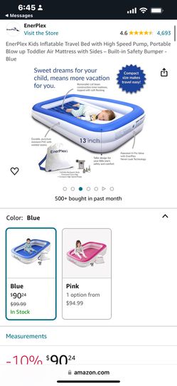 EnerPlex Kids Inflatable Travel Bed with High Speed Pump, Portable Blow up Toddler Air Mattress with Sides – Built-in Safety Bumper - Blue$75San Antonio, TX