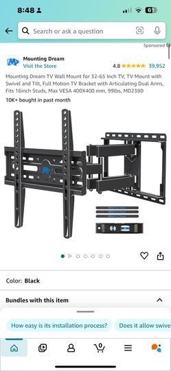 Mounting Dream TV Wall Mount for 32-65 Inch TV, TV Mount with Swivel and Tilt, Full Motion TV Bracket with Articulating Dual Arms, Fits 16inch Studs, $40San Antonio, TX