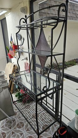 Baker's rack, featuring a dark metal frame, glass shelves, and built-in wine glass storage.$99North Lauderdale, FL