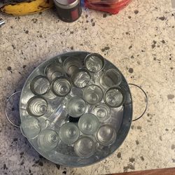 Rustic galvanized metal round tray with 19 shot glasses $14Lancaster, CA
