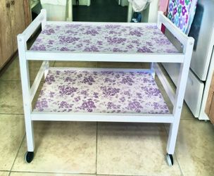 Farmhouse wheeled wood cart. White w/purple flowers + leaves print w/2 shelves$55Costa Mesa, CA
