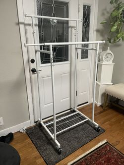 Double Rod Garment Rack, Heavy Duty Rolling Clothes Rack with Wheels For Hanging Clothes, Portable Metal Clothing Rack with Shelves,White, it is 64 in$45Mountlake Terrace, WA