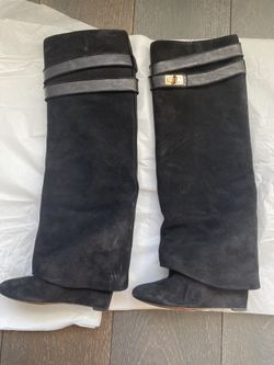 Givenchy 'Shark Lock' boots in Blacksuede with gold hardware featuring covered wedge heel. Fold-over shaft creates pant-leg silhouette. Hav$850New York, NY