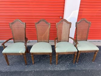 Vintage oakwood dining chairs with a cane back and upholstered seat (4)$250Glen Ellyn, IL