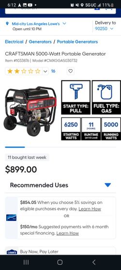 CRAFTSMAN 5000-Watt Portable Generator$650Inglewood, CA