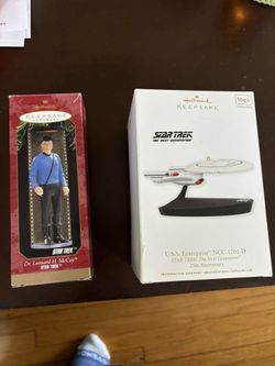 set of 2 star trek ornaments. Dr McCoy & 25th anniversary enterprise ncc1701-d $25Aurora, IL