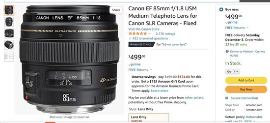 Canon Prime Lens 85 mm 1: 1.8 $350Cerritos, CA