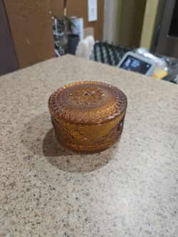 vintage Tiara Exclusives round puff box with a lid in amber "Sandwich" pattern glass. $20Clearwater, FL