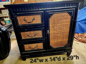 Bamboo and Wicker Cabinet in black and natural bamboo wood. 3 drawers and a cabin