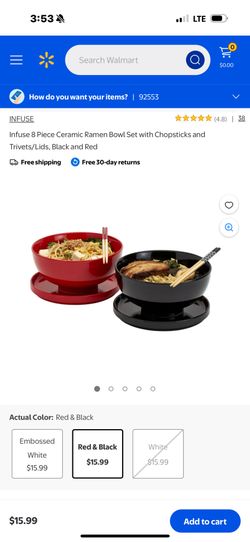 Infuse 8 Piece Ceramic Ramen Bowl Set with Chopsticks and Trivets/Lids, Black and Red$10El Cajon, CA