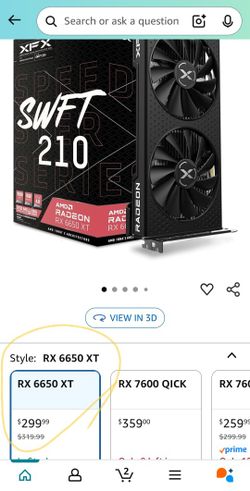 XFX Speedster SWFT210 Radeon RX 6650XT CORE Gaming Graphics Card with 8GB GDDR6 HDMI 3xDP, AMD RDNA 2 RX-665X8DFDY$250Hampton, VA