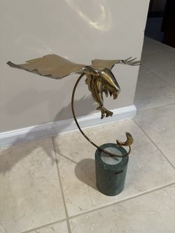1980’s BIJAN Soaring brass Eagle sculpture swooping down to catch fish on signed marble pedestal, Parkland $300Pompano Beach, FL