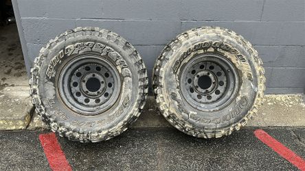 Five 16-inch steel jeep wheels with old tires 5 on 127mm $80Montebello, CA