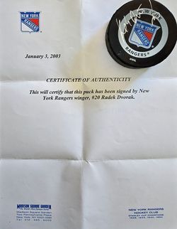 New York Rangers winger, #20 Radek Dvorak. Signed Puck$40Boca Raton, FL