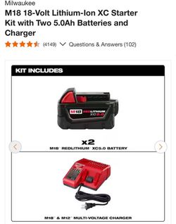 Milwaukee M18 18-Volt Lithium-Ion XC Starter Kit with Two 5.0Ah Batteries and Charger$140Mesquite, TX