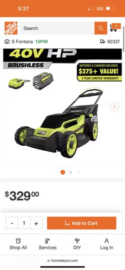 RYOBI ONE+ HP 18V Brushless 16 in. Cordless Battery Walk Behind Push Lawn Mower with 4.0 Ah Batteries and Charger$139Riverside, CA