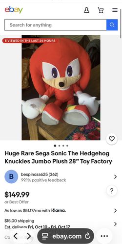 Huge Rare Sega Sonic The Hedgehog Knuckles Jumbo Plush 28” Toy Factory$30Carson, CA