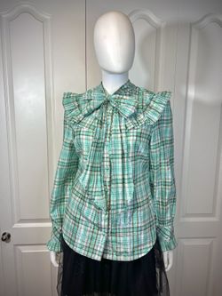 Macy’s Charter plaid mint and brown metallic frilly button-up blouse shirt$25Tumwater, WA