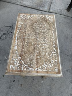 hand-carved wood side table with a white or distressed white finish applied to the legs $45Carlsbad, CA