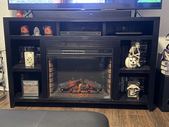 Black modern T.V. Console Stand..with 7 cubby hole shelves with built in heater/4 different settings for display fireplace logs as nite lite or while $500Fort Worth, TX