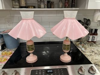 Girls Pair of Vintage Pink Plastic Ruffle White Lace Top Lamps, Shade Flamingo Powder Pink Scalloped edge top metal wire. Excellent condition$165Auburn, GA