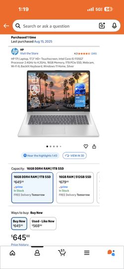 HP 17t Laptop, 17.3" HD+ Touchscreen, Intel Core i5-1135G7 Processor 2.4GHz to 4.2GHz, 16GB Memory, 1TB PCIe SSD, Webcam, Wi-Fi 6, Backlit Keyboard, W$600Ellicott City, MD