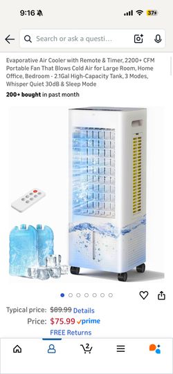 Evaporative Air Cooler with Remote & Timer, 2200+ CFM Portable Fan That Blows Cold Air for Large Room, Home Office, Bedroom - 2.1Gal High-Capacity Tan$70Chicago, IL