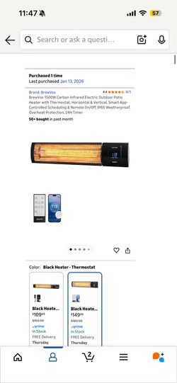 BrewVox 1500W Carbon Infrared Electric Outdoor Patio Heater with Thermostat, Horizontal & Vertical, Smart App-Controlled Scheduling & Remote On/Off, I$115Chicago, IL