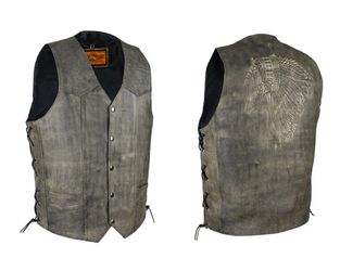 Men's Motorcycle Distressed Gray Brown Leather Side-Laced Conceal-Carry Club Vest With Embossed Native American Head$150Apache Junction, AZ