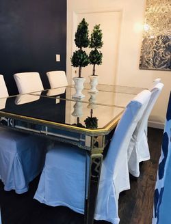 Mirrored Z Gallerie Dining table with 6 Slipcovered White Chairs $700Chula Vista, CA