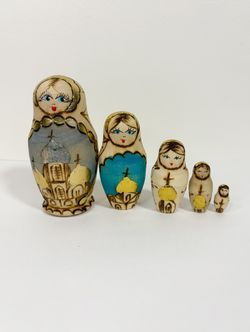 Russian Birch Wood Nesting Doll Set Of 5 Burned-Hand Painted Gold Leaf Blue 4”$20Chandler, AZ
