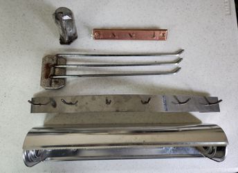 Vintage 1960's kitchen hanging accessories including hook racks, dish towel drying arms and aluminum foil holder.