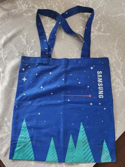 Samsung canvas shoulder tote bag in mostly blue and teal colors with white stars and 2 carrying handles. 15" x 15".