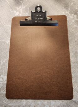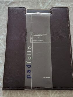 Brown vinyl writing paper pad holder with chrome-plated clip, inside pocket, pen holder and 2 business card holders.