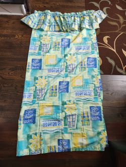 1- Vintage single curtain panel with sewn on valance on top and 12 hook holes on top. About 70" Long x 66" Wide.