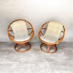 SoldVintage Boho Coastal Rattan Swivel Lounge Bamboo Chairs — Pair with Original Tufted Cushions Free Deliver In Select SD$250Chula Vista, CA