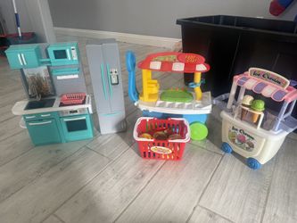 Toy Food Cart/Ice Cream Cart/Mini Fridge In Kitchen Set With A Basket Of Food$25San Bernardino, CA