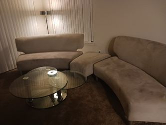 Two Beautiful Chic Off White Velvetly Fabric Couches Thats Very Comfortable With Beautiful Triple Glass Silver Chic Coffee Table. $450Seattle, WA