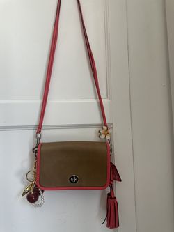 Coach Archive Turnlock Crossbody Bag Tan Brown Coral Pink Trim Tassel Leather$90Los Angeles, CA