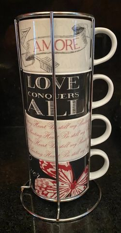 Pier 1 Imports stackable porcelain coffee mugs with a metal rack.$15Homosassa Springs, FL