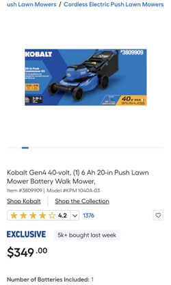 Kobalt Gen4 40-volt, (1) 6 Ah 20-in Push Lawn Mower$300Auburn, WA