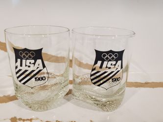 Lot of 2 Vintage RARE 1980 Olympics USA Team Rocks Glasses Glass Clear Black Logo Bar Kitchen Decor $5Schererville, IN