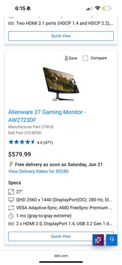 Alienware 27” Gaming Monitor 280hz Aw2723df$425Chula Vista, CA