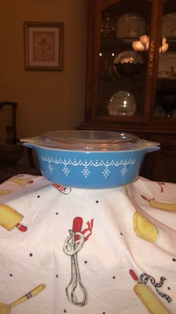 Vintage Pyrex, Round “ Blue Snowflake Garland” Casserole with lid. 1 pt. # 471 $20Chandler, AZ