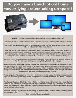We Turn VHS tapes into discs or files you can watch on your tv or computer$25Spring Hill, FL