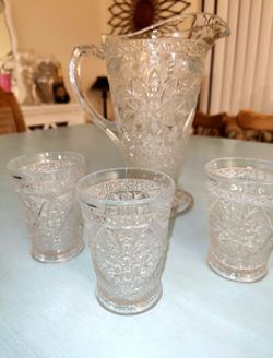 Antique Set Pressed Glass Wine Water Pitcher with 3 Matching Glasses 8oz 1960 Kendall Area $25Miami, FL