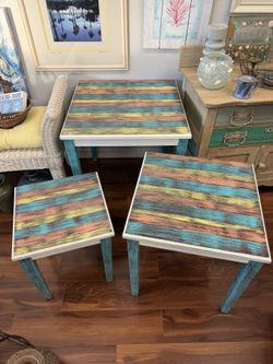 Set of 3 Coastal Nesting Tables – Hand-Painted Wood Tops, Teal Legs | Beach Cottage Style$165Sarasota, FL