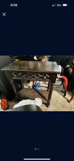 This is a dark wood end table or nightstand with gothic quatrefoil carved detailing. $300San Diego, CA